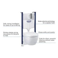 This Solido Tectron Bau E / Bau Rimless Complete WC 5 in 1 Pack offers state of the art technology, including touchless flush activation, for maximum convenience and hygiene. The wall hung toilet features rimless technology, it’s easy to clean and there are no corners or crevices, which are playgrounds for bacteria. Both seat and lid have a gentle and quiet soft-closing mechanism to add a little more comfort. The Tectron Bau E flush plate with long lasting battery has an integrated infra-red sensor, that detects hand or body movement, so water runs without you needing to pushing any buttons. This means there is an automatic flush after you leave the toilet.